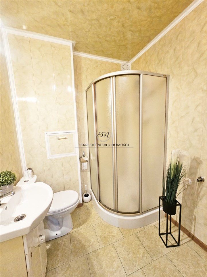 łazienka z WC, wyposażona w prysznic oraz wydzielone miejsce na pralkę,