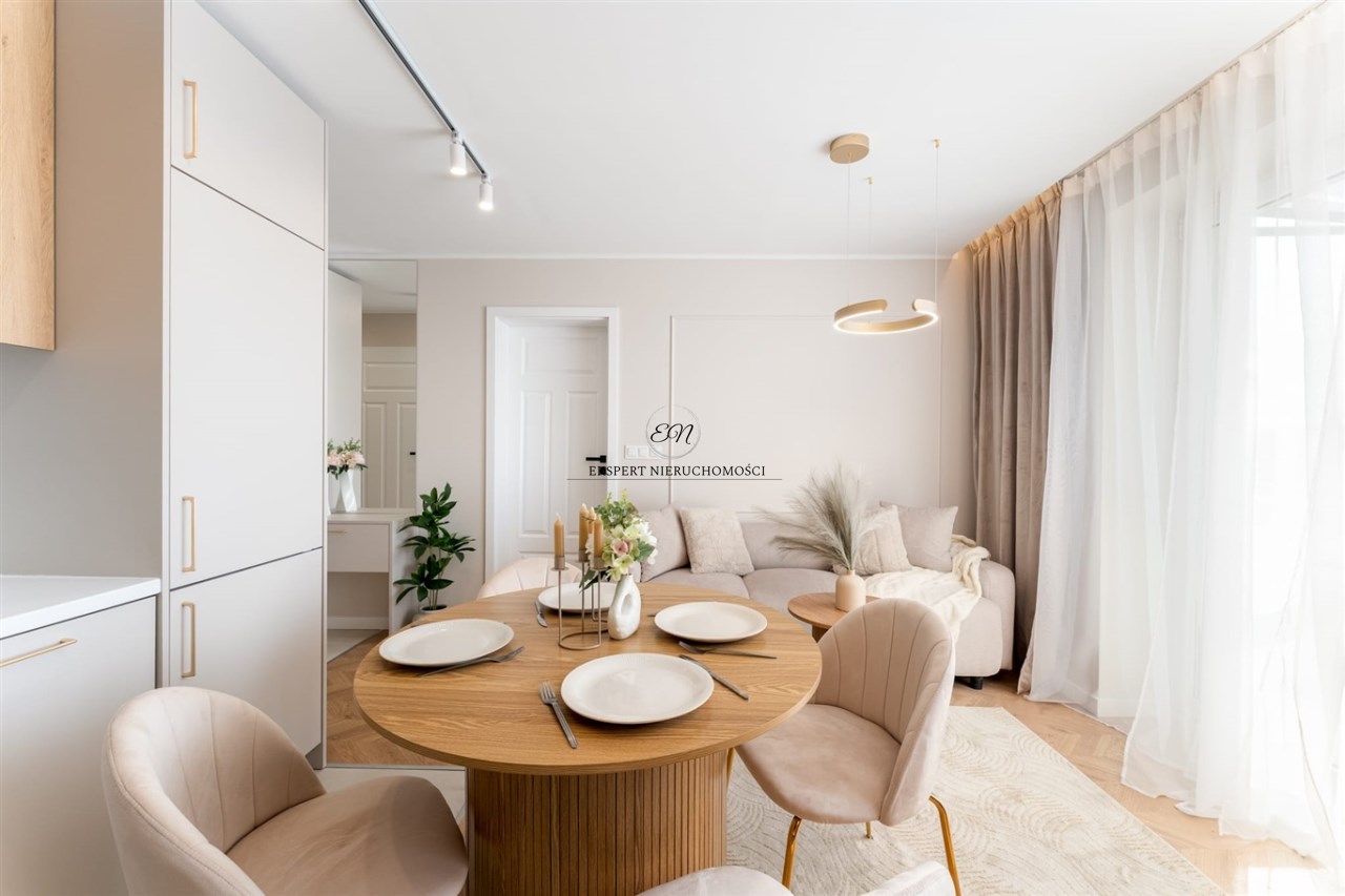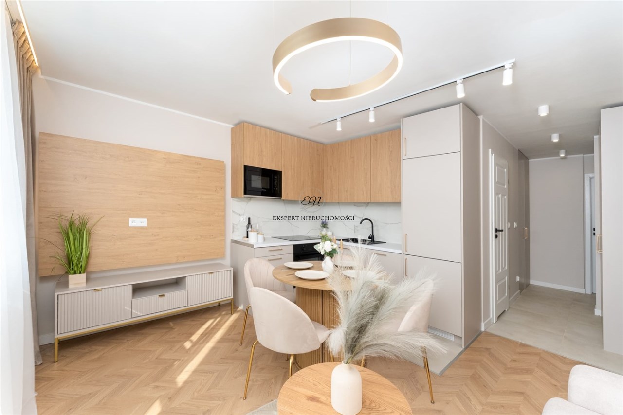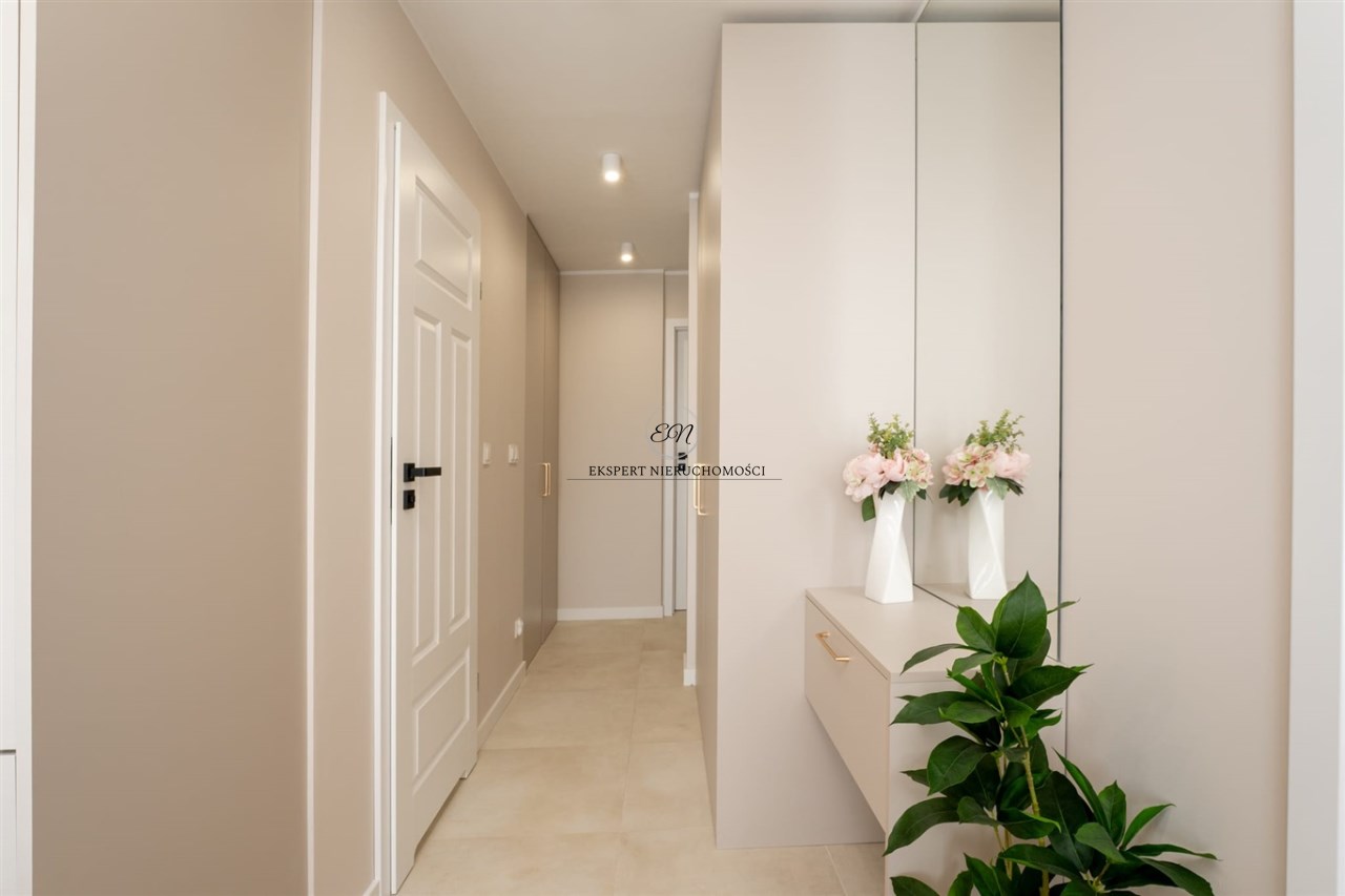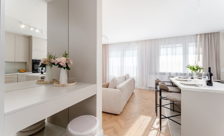 Wnętrze zostało wyposażone w zabudowy wykonane na wymiar, obejmujące kuchnię, przestrzeń w przedpokoju oraz elementy łazienki, co zapewnia spójność estetyczną oraz maksymalne wykorzystanie przestrzeni.